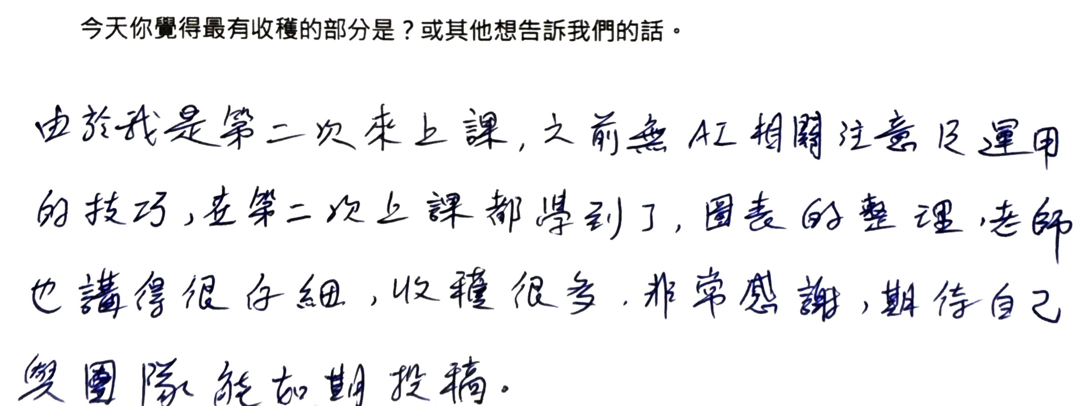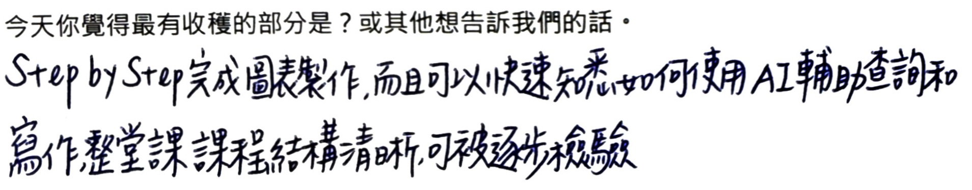 - 一位同學是第二次上課,並留下評論:「很久之前上課,並沒有 AI 相關注意及運用的技巧,這次上課都學會到了!」我們課程會教各位如何做搜尋,如何找到適合自己的題目,即使你一開始沒有任何頭緒,也能夠上手。