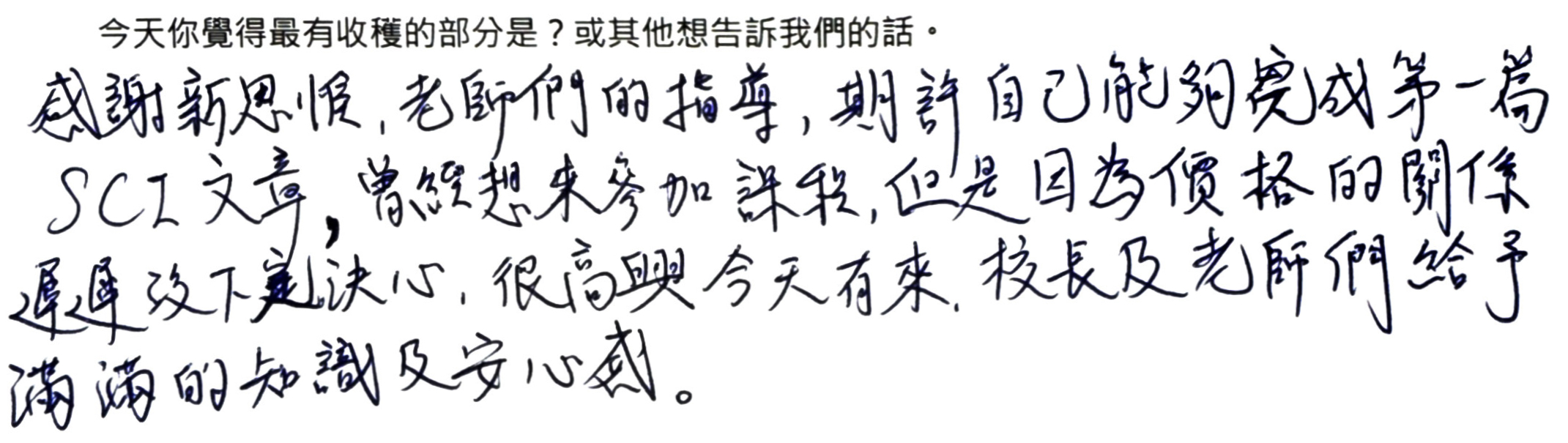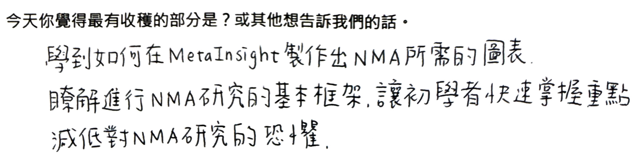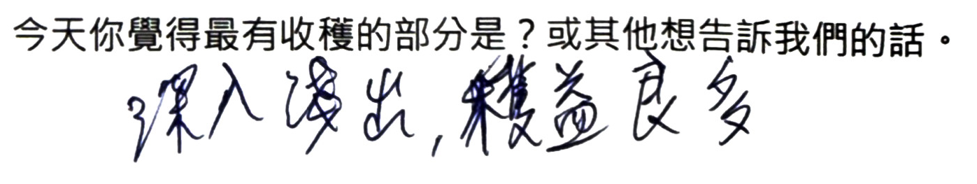 感謝大家課後的匿名手寫回饋,內容非常精彩,包括對課程的評價以及學會使用軟體時的心情,顯示不管是研究初心者或是資深研究者,都能在工作坊中有豐富的收穫,很榮幸新思惟的課程能給您前所未有的突破和啟發!